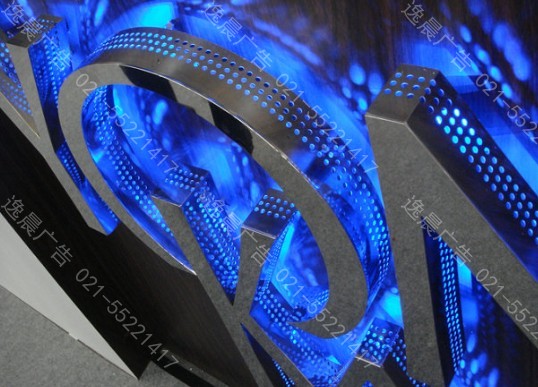 制作过程:通过对不锈钢和亚力力的定型,和不锈钢发光字的工艺一样,区别是要在不锈钢侧钻成直径相同的均匀排布的小孔。