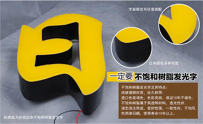 树脂发光字是由不饱和聚脂树脂、字壳(多用于不锈钢字壳)、led光源组成 。其优点是发光通透、密封防水、耐高温寿命长。