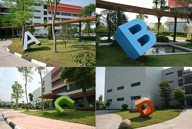 这套系统有个设计的特别之处:在每座建筑的入口前,树立着一个高达2米的三维字母模型标识,标示出该座建筑的编号,分别是A、B、C、D;其视觉效果的独特醒目性,使人们从远处就可以轻易地辨认出大楼的编号,很好地起到了地点标识作用。