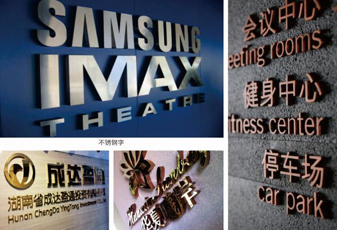 金属字包括:铜字、铁字、不锈钢字、钛金字、LED发光字、耐指纹不锈钢拉丝字、8k不锈钢亮面字、镀钛金字、24k镀真金字、24k贴金字、镀镍字、镀铬字、沙银字、花纹烤漆字、水纹透光字、实心电镀字等。