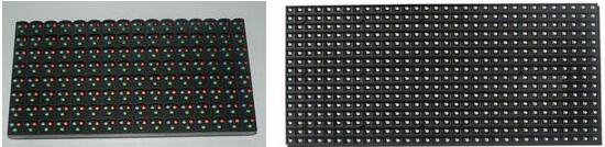 由单元板拼接而成,而单元板从外观上差异可分两类:一类叫做三合一拼贴,就说在外观上看每个发光点很明显是由红绿蓝三个单独的LED拼成的,另一类叫做三合一表贴,在外面只能看到一个LED灯,其实在内部是封装好了三个LED灯芯的