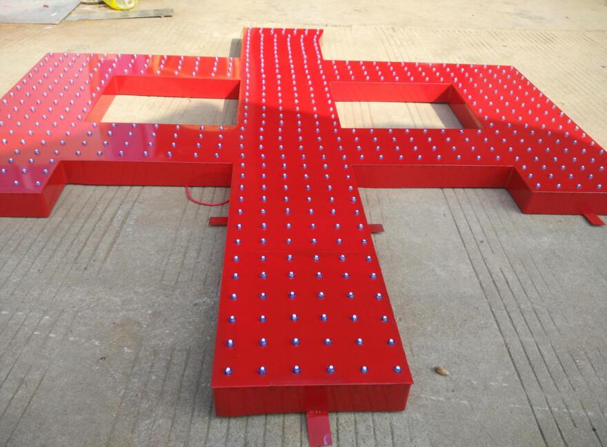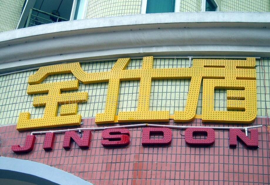 外露字又名冲孔字,占阵发光字;是对不锈钢、铝板、镀锌板进行冲孔加工而后,再安培LED外露灯,最终形成鲜明耀眼,亮度高的广告效果;外露发光字是如何制作的,外露发光字又被称为不锈钢冲孔发光字、钛金字、锌铁字等,分别由不锈钢板,钛金板,镀锌铁板冲孔后,装上LED防水灯串制作而成。首先是选材,做什么字,选什么材料,根据字体大小,安装的位置和客户的要求,选择相应的板材,然后把整张的板材用机床进行冲孔,然后用刻机对面板刻出字形,然后把刻好的字焊接成立体边,再进行打磨光滑,避免毛刺。然后就是喷烤油漆,油漆干后,就可以装LED单颗灯串了,装灯串的时候务必要考虑能够方便最后的接线,每颗灯用橡胶套做风水处理,这么做也比较有利于后期对外露发光字进行维护。